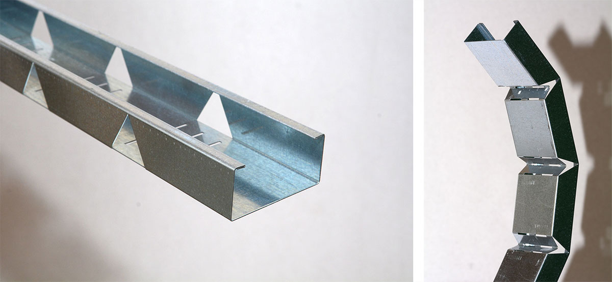 Благодарение на специалната си конструкция, винтовете могат да бъдат закрепени във всяка точка по дължината на профила, гипскартонът може да застане перфектно върху металната рамка, следвайки кривината на детайла.