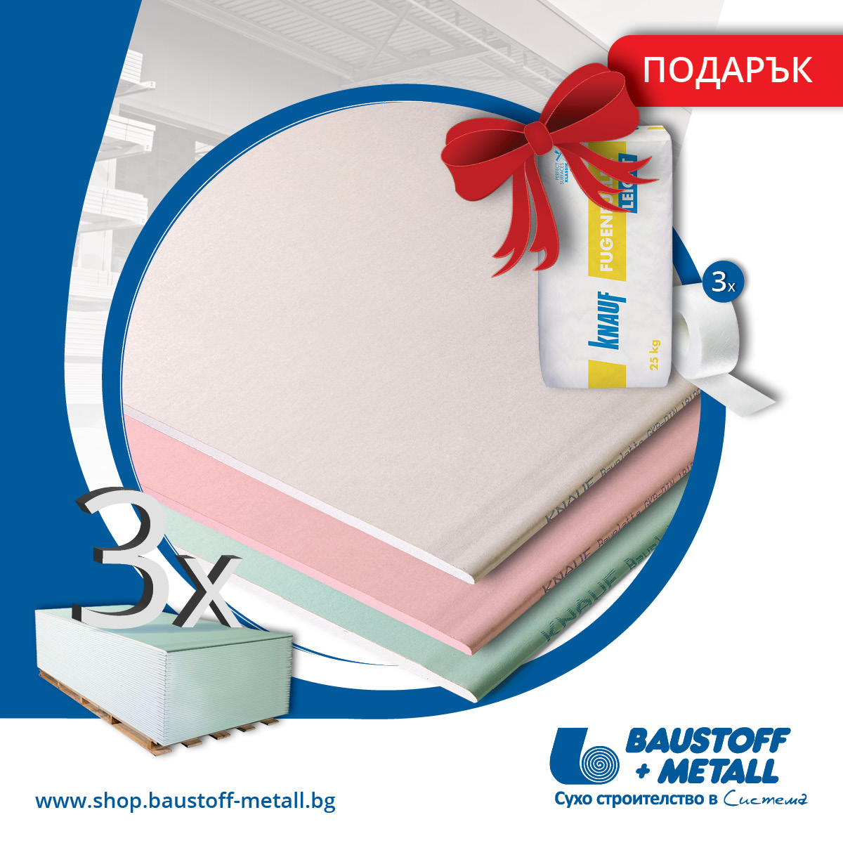 - При покупка на минимум 3 палета гипскартон Knauf от склад на Baustoff+Metall, получавате подарък: