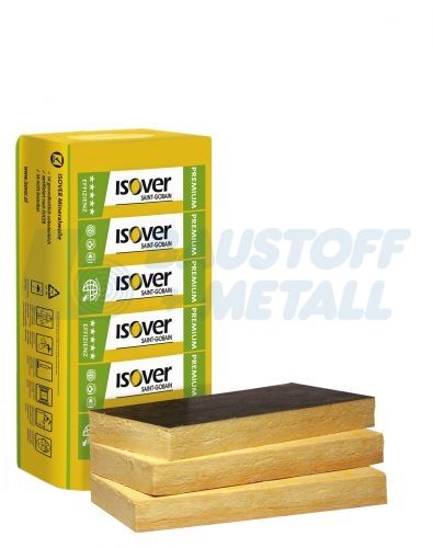 Стъклена вата Изовер P-FDPL SV, коефициент на топлопреминаване ламбда λD 0,031 (W/m.K), реакция на огън Евроклас А1, едностранно каширана с черен стъклен воал, дебелина 50 мм, размери 1200 мм х 600 мм, пакет 7.2 м²