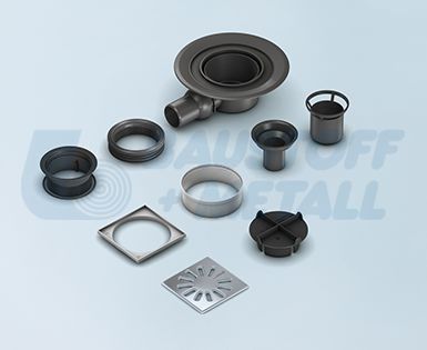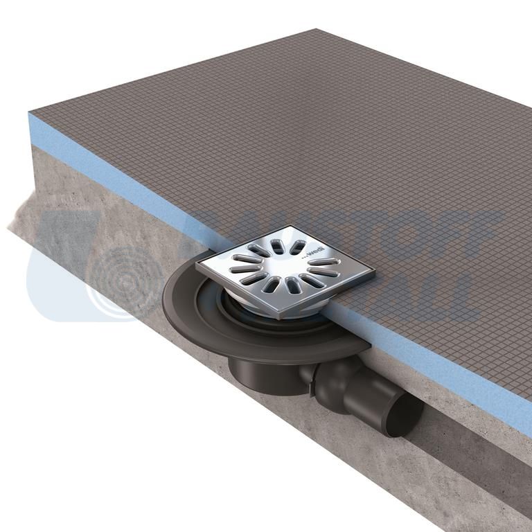 Подов сифон комплект за баня с квадратна решетка и хоризонтално оттичане ВЕДИ DN 50, за душ елементи / плочи с наклон wedi Fundo с точково оттичане.