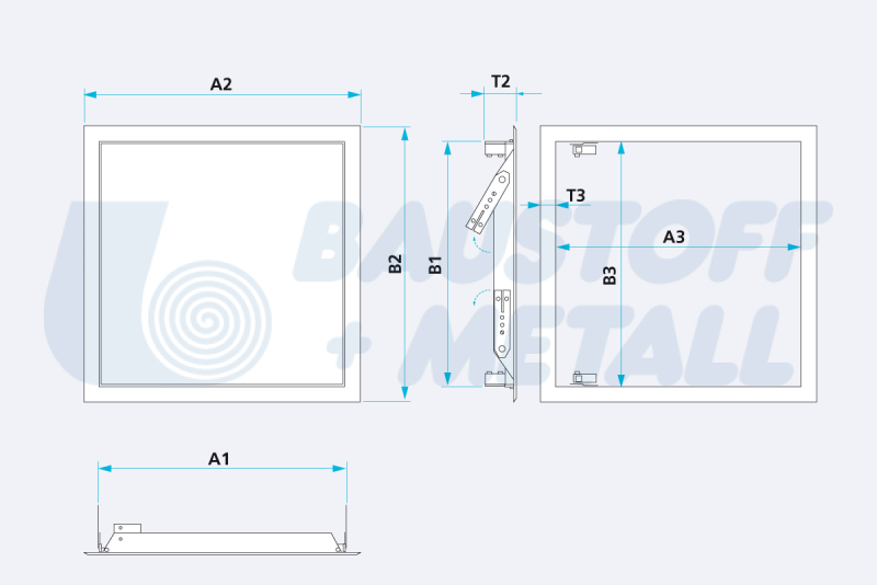 Ревизионна клапа RUG Softline Comfort размери 300x300 дебелина 20 мм ревизия с бяла устойчива прахово-боядисана повърхноств в RAL 9016, за монтаж на таван и стена, със скрита ключалка, крилото на вратите се отделя, може да се монтира отляво или отдясно, с крепежни стенни анкери за безопасна инсталация, произведена в Германия