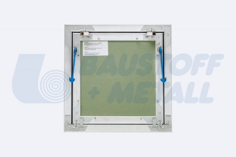 Ревизионна клапа RUG Alumatic размери 400x400 мм, ддебелина 25 мм, с висококачествено гумено уплътнение, подходящ за мокри помещения, за таван и стена, със заключващ механизъм и лесно демонтиращ се капак с вграден гипскартон H2 / GKBI 25 мм, произведено в Германия