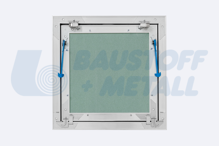 Ревизионна клапа RUG Alumatic размери 300x300 мм, дебелина 25 мм, с висококачествено гумено уплътнение, подходящ за мокри помещения, за таван и стена, със заключващ механизъм и лесно демонтиращ се капак с вграден гипскартон H2 / GKBI 25 мм, произведено в Германия
