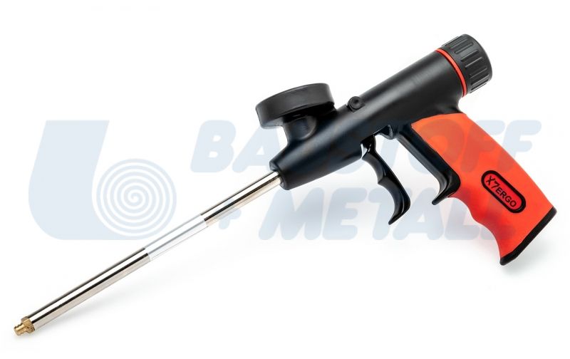 Лек пластмасов/алуминий пистолет за пяна Irion Ерго X7 с метални тръба и спусък, адаптер с PTFE не залепващ връх, голям регулиращ винт с удобен захват, ергономична и меко гумирана ръкохватка и оптимизирана струя на пяната