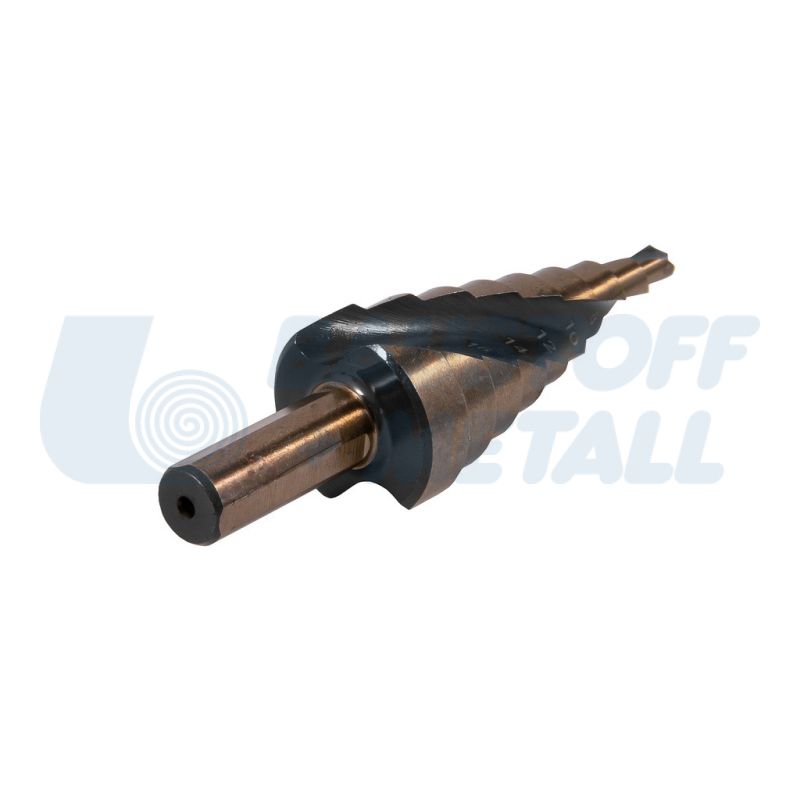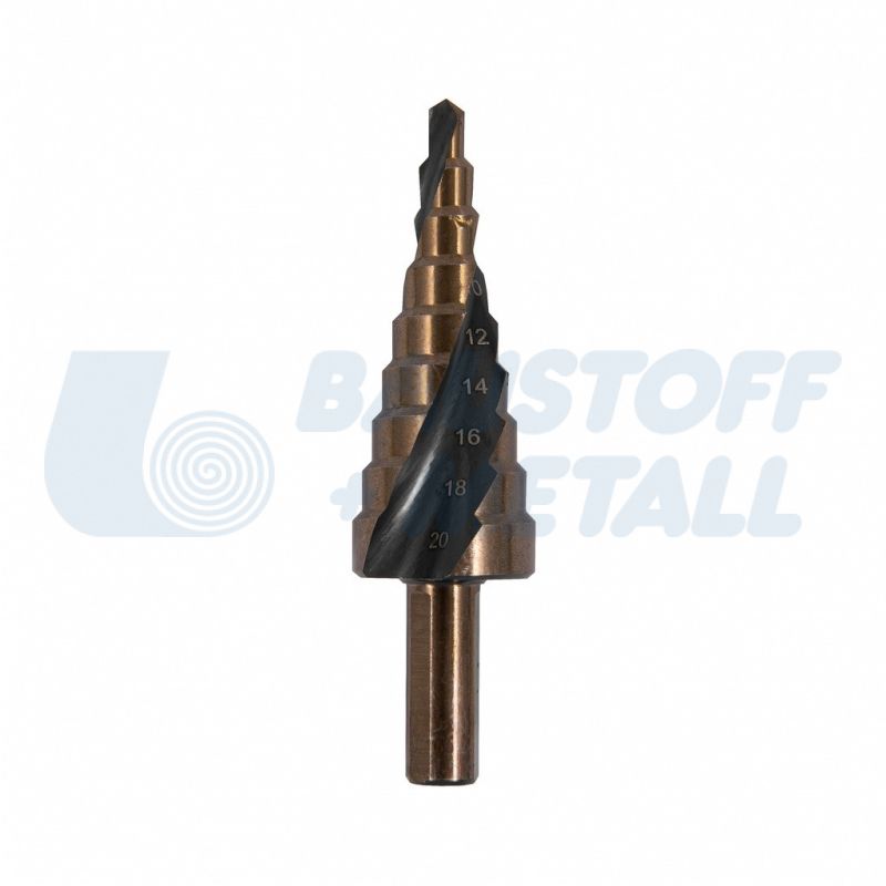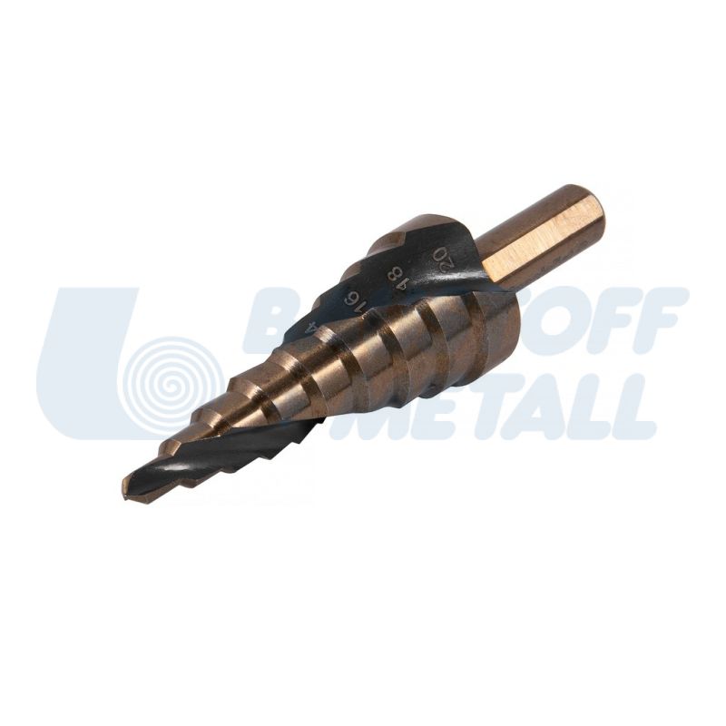 Стъпаловидно свредло Ø4-20 SPECIALIST, изработено от М2 стомана - осигурява издръжливост и здравина на свредлото, титаниевото покритие (TIN) намалява ефекта на триене - свредлото пробива по-бързо и не се нагорещява много, всяка стъпка е заточена за пробиване и автоматично почистване, пасва здраво в патронника на електроинструмента и не приплъзва, за пробиване на цветни и леки метали, ламарина от неръждаема стомана, на стоманена ламарина и пластмаси.