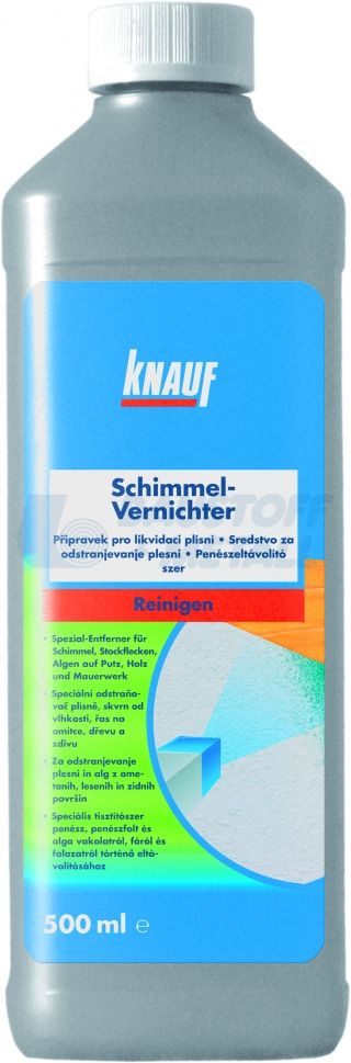 Противоплесенен грунд Кнауф 500 мл, високоактивен дезинфектант срещу петна от плесен и мухъл, универсален препарат за премахване на гъби, плесени и мъхове от различни видове облицовки, отлично дезинфекциращо средство за унищожаване на плесени по стенни облицовки с плочи от естествен или изкуствен камък, дървени и пластмасови повърхности, силиконовии циментови фуги, използва се и в случай на развитие на гъби, плесени или мъхове.