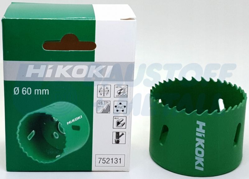 Корона HSS BI-METAL 60 мм Hitachi Hikoki 752131 изработена от удароустойчива стомана с висока износоустойчивост и закалени зъби от легирана бързорежеща стомана, предназначена за рязане на дърво, пластмаса, гипскартон, цветна, черна и неръждаема стомана