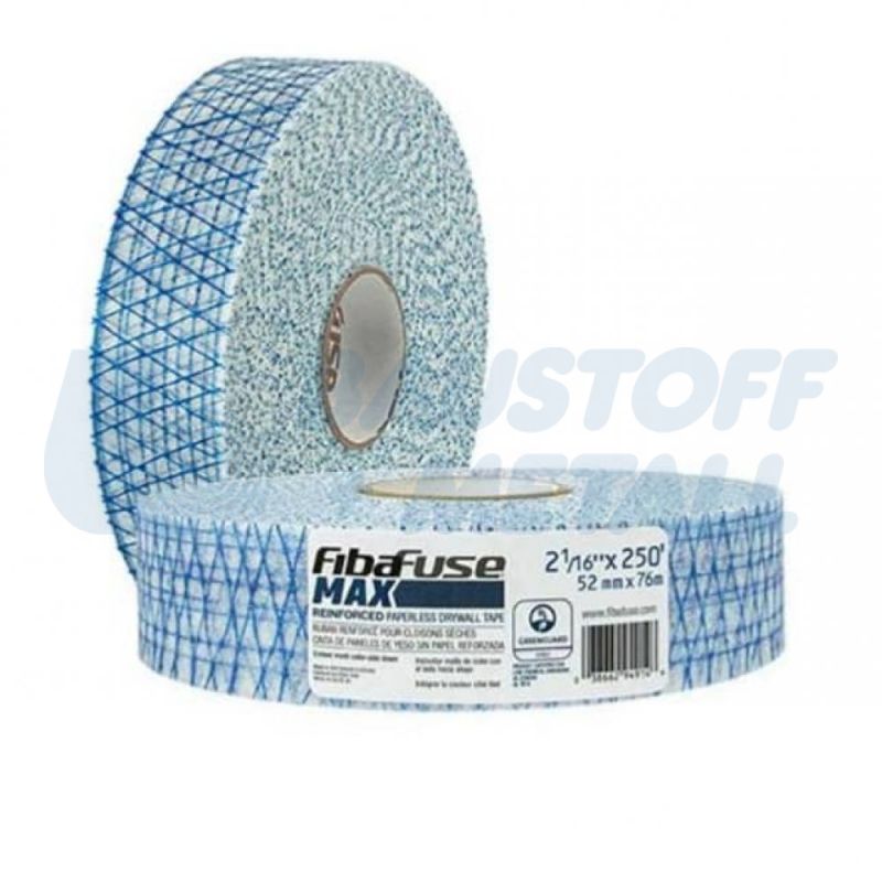Лента стъклофазерна усилена FibaFuse MAX 76 м иновативна, подсилена безхартиена лента за гипскартон, предназначена за професионални ремонти, с порест дизайн позволяващ съединението да тече през лентата за по-здрава връзка, премахвайки мехурчета, със син подсилващ слой с трипосочна конструкция, която осигурява устойчивост на пукнатини в множество посоки и предотвратява случайно разкъсване на лентата по вътрешните ъгли, лесена за работа, реже се лесно и има прегъване в средата за вътрешни ъгли, широчина 52мм, дължина 76м