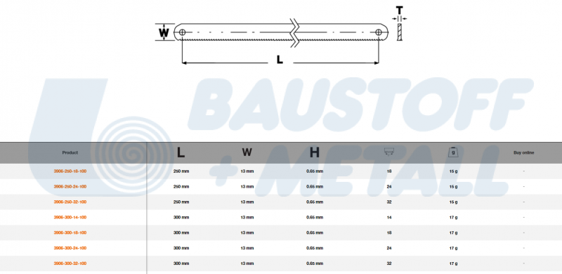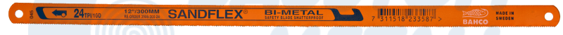 Биметален лист за ръчна ножовка 300 мм BAHCO 3906-300-24-100 предназначен за рязане стомана, Sandflex® BI-METAL технология, практически нечуплива основа от еластична пружинна стомана и прецизно шлифовани зъби от високолегирана бързорежеща стомана.