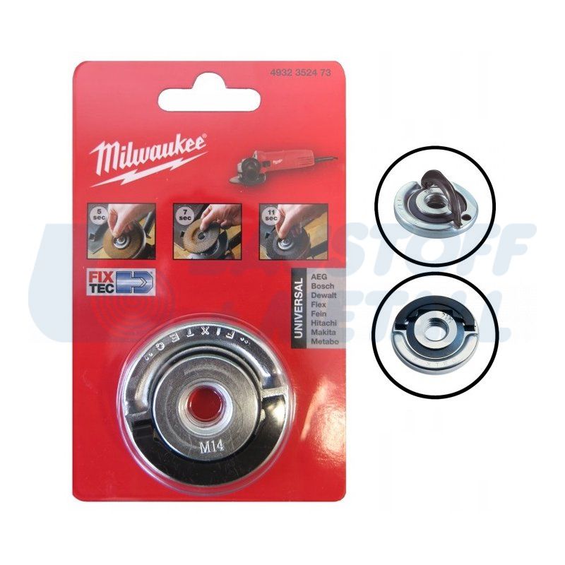 Гайка M14 за ъглошлайф Milwaukee бързозатягаща със система FIXTEC, която позволява бърза и лесна смяна на консумативи без допълнителни инструменти, подходяща за всички ъглошлайфи с резба M14