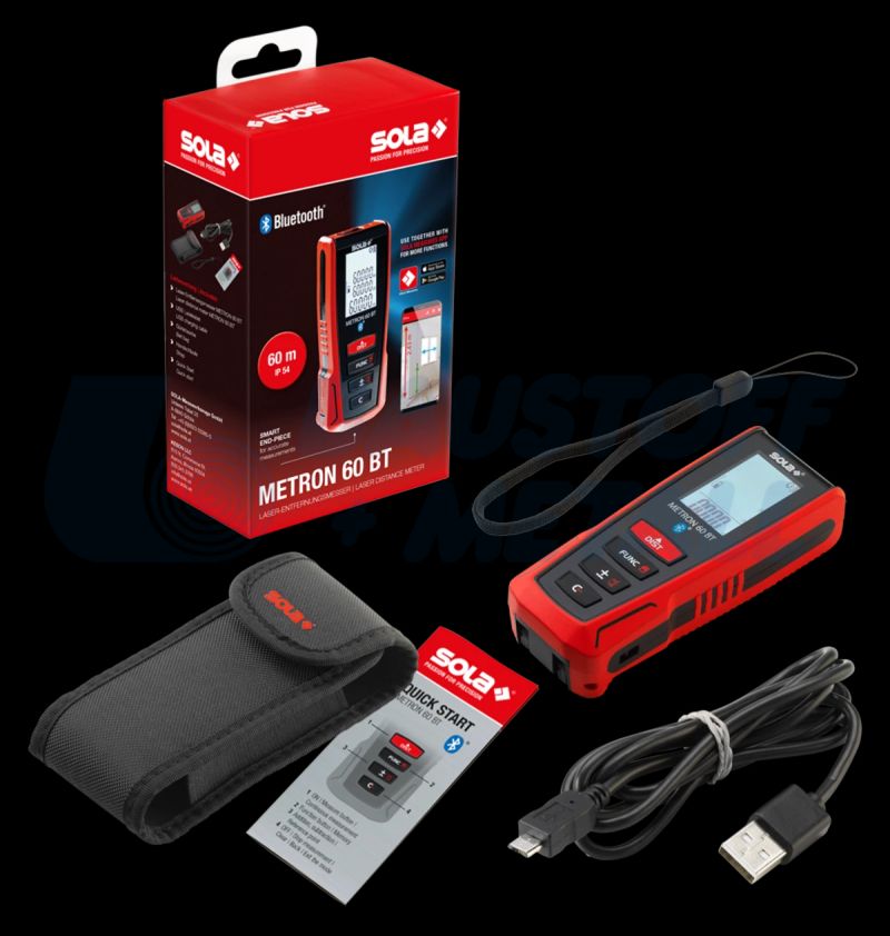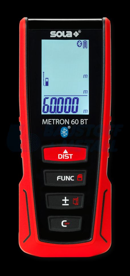 METRON 60 BT позволява измервания до 60 m с точност от ± 1,5 mm. Устройството има девет измервателни функции, включително памет за измерената стойност и е подходящо за разнообразни приложения. С интегрирания Bluetooth интерфейс измерените стойности могат да се прехвърлят директно и безжично към вашия смартфон или таблет чрез приложението SOLA Measures.