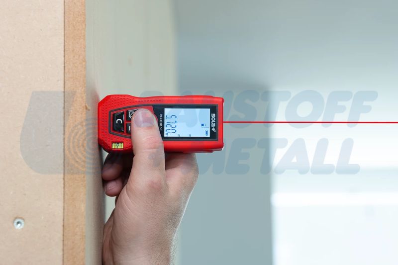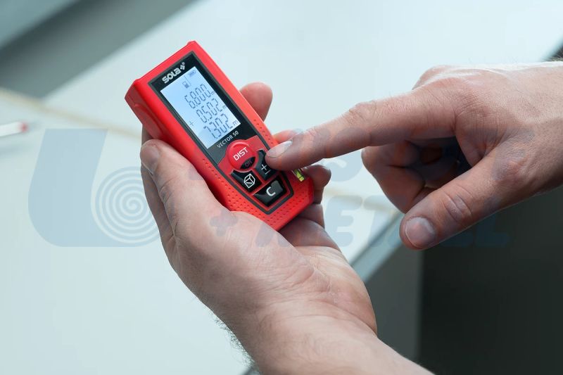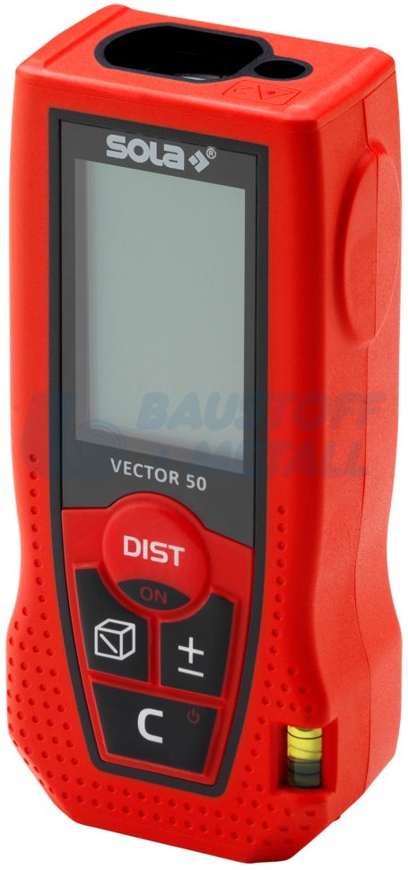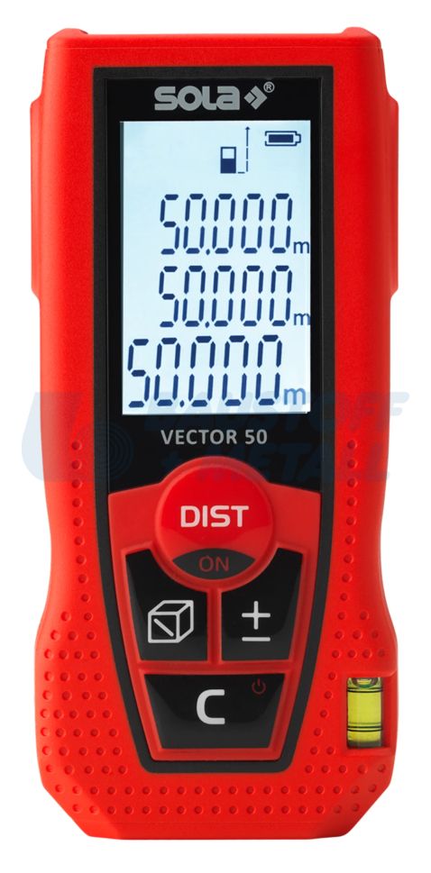 Лазерна ролетка SOLA Vector 50 , от 0,15 до 50 m работен обхват, седем измервателни функции: измерване на дължина, измерване на площ, измерване на обем, измерване на мин./макс., непрекъснато измерване, индиректно измерване в 2 точки, събиране/изваждане, 3-редов дисплей с подсветка за бързо четене, независимо от светлинните условия, вграден нивелир за прецизни измервания, мек захват и ергономичен дизайн, автоматично изключване, компактен, лек, удобен, толеранс на измерване ±1,50 мм, работна температура от 0 °C до +40 °C, размери 105 х 47 х 27 мм