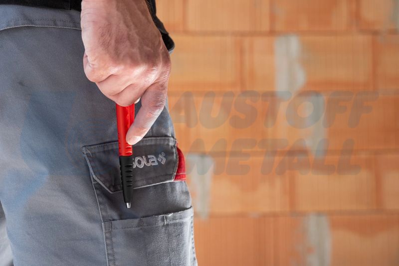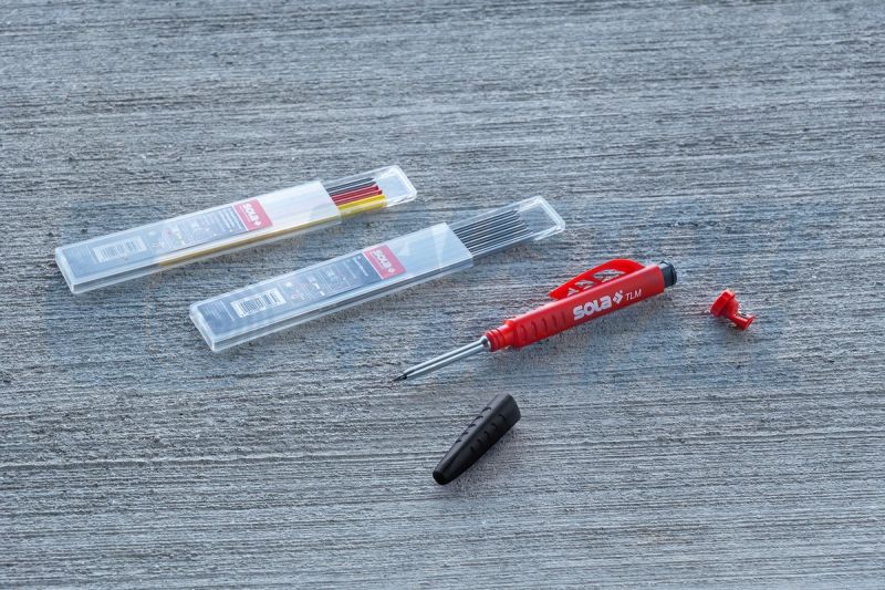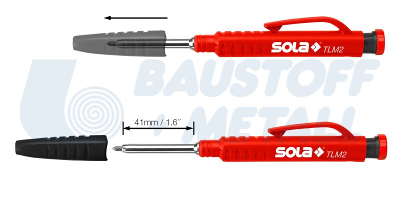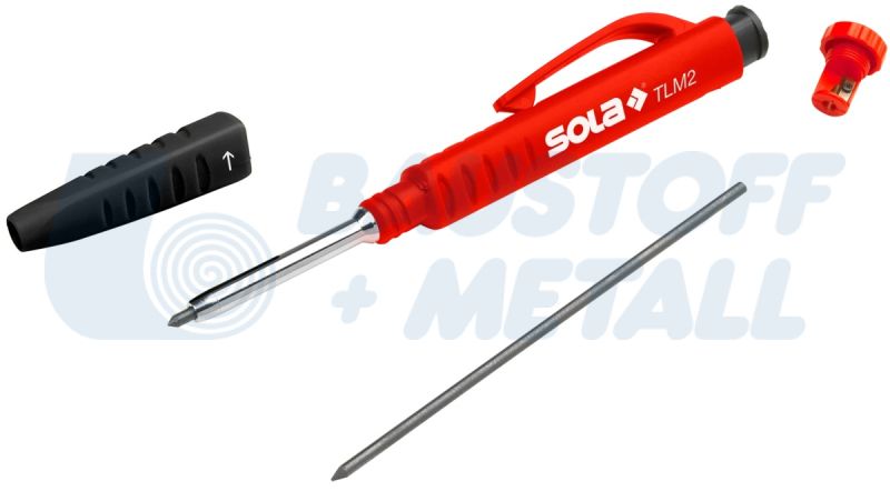 Молив автоматичен дълбоки отвори TLM2 Sola, две функции: механичен молив и молив за дълбоки дупки, благодарение на подвижната капачка, специалният дизайн улеснява маркирането на дълбоки дупки до 45 mm (1,78") дълбочина, олово с малък диаметър за прецизно маркиране, вградена острилка в бутона, здрава ABS скоба за колан за сигурно задържане