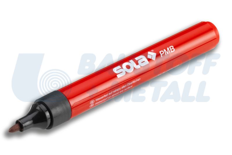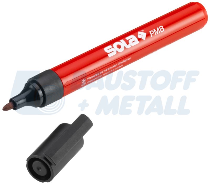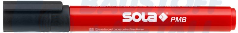 Перманентен маркер SOLA PMB цвят черен, дължина 13,8 см, материал - висококачествена пластмаса, водоустойчив на почти всички повърхности, светлоустойчив и бързосъхнещ, не се търкаля по време на работа благодарение на щипката, особено подходящ за пластмаса, картон, метал, стъкло, гума и дърво.