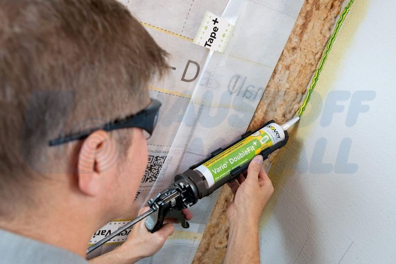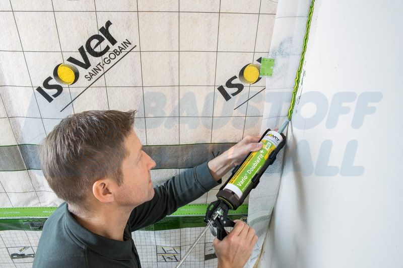 Isover Vario® DoubleFit+ е двукомпонентна уплътнителна смес без разтворители, устойчива на разкъсване, подходяща за извършване на всички херметични връзки на части от сгради, напр. фронтонни стени, греди, прозорци, врати. Не е необходима притискаща летва, полага се на дебелина. 7-8 mm за осигуряване на трайна херметична връзка на пароизолацията и периметърната зидария. Опакован е в практичен патрон или в по-голяма, почти безотпадна опаковка (валяк, обвит във фолио). Може да се прилага при температури ≥ –5°C.