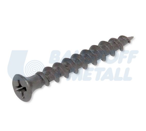 Винт за гипсови плоскости от нелегирана стомана със специална геометрия за закрепване на гипсови плоскости върху гипсови плоскости. Винтът има остър връх и е защитен от корозия с фосфатизация.