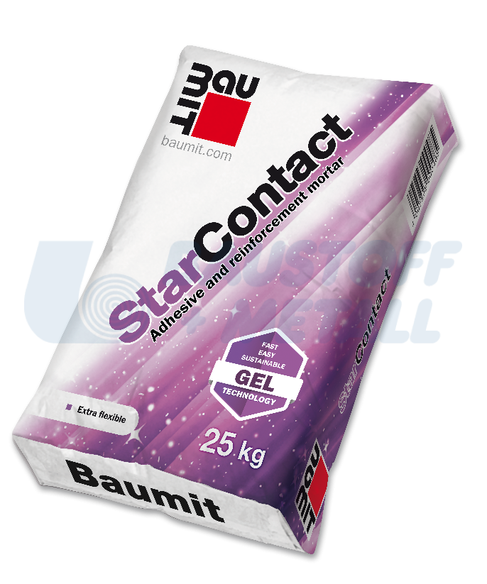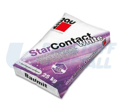 Най-висок клас бяла лепилно-шпакловъчна смес, изпитана в система по ETAG 004. За сгради до 10 м височина, върху обезпрашена червена тухла топлоизолационната система може да се изпълни без дюбелиране, при изричното писмено разрешение на Баумит служител. Баумит СтарКонтакт бял позволява полагане на крайни покрития (Баумит пастообразни мазилки) без предварително грундиране на основата с Баумит УниПраймер. Това не важи за случаите на много високи температури на въздуха (>+30°С), когато шпакловъчният слой пресъхва, или когато шпакловката е престояла без положено върху нея крайно покритие за период по-дълъг от 14 дни.