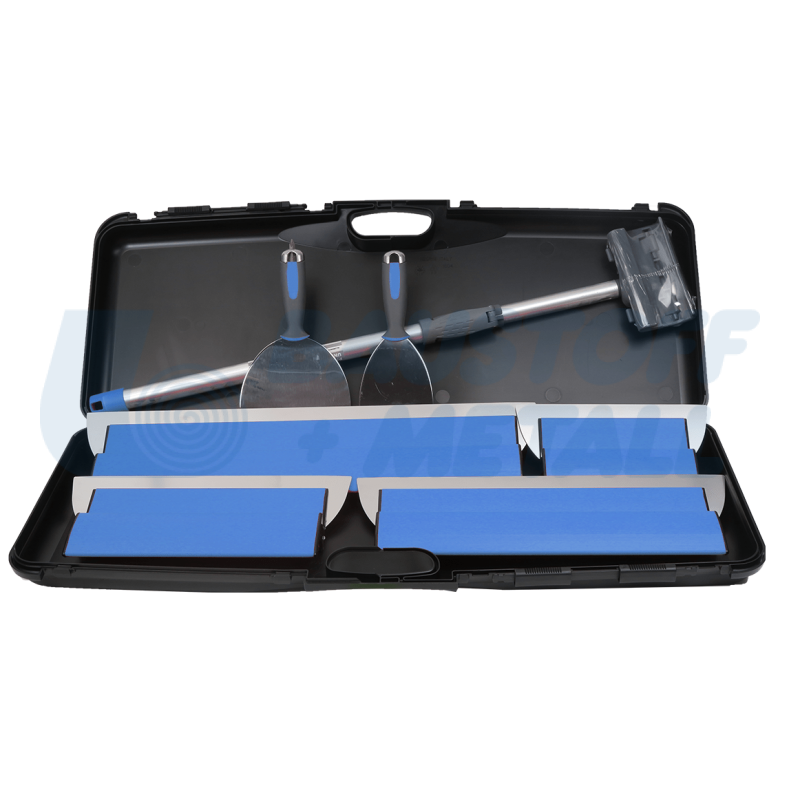 Комплект 7 инструмента за сухо строителство в куфар Knauf, ножове с дължина: 25 см, 35 см, 45 см, 60 см, шпакли за гипскартон: 10 см, 15 см, телескопична дръжка 2 х 0,6 м и транспортен куфар за инструменти