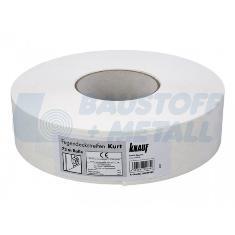 Лента хартиена Knauf KURT, армираща лента за гипскартон, широчина 50 мм, дължина 75 метра, за обработка на фуги и вътрешни ъгли при стени от гипскартон с фабричен подгъв за лесен монтаж и прецизно оформяне на вътрешни ъгли, с подсилващи синтетични влакна, лесна за монтаж, не се разтяга при намокряне, предотвратява появата на пукнатини и силно устойчива на разкъсване.