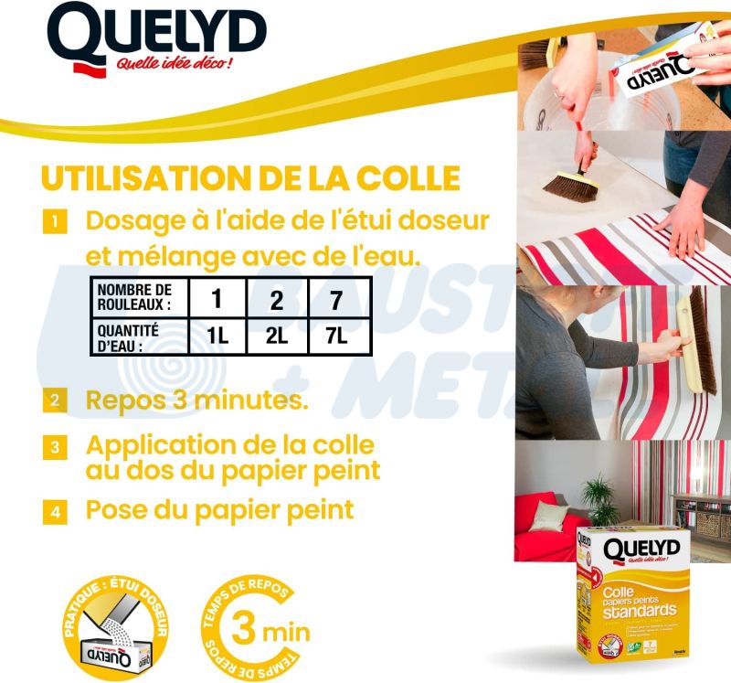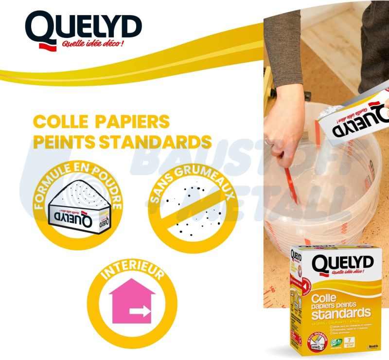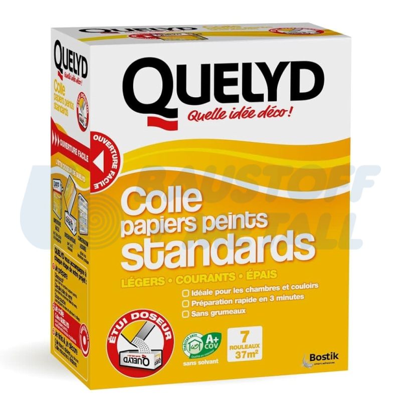 Стандартното лепило за тапети Quelyd залепва всички видове тапети: обикновени, леки, дебели, миещи се, излужващи се, релефни и двустранни. С формула, специално разработена, за да улесни приготвянето на лепилото благодарение на капачката за дозиране и да оптимизира залепването на тапетите, без разтворители осигурява приготвяне за 3 минути и без бучки.