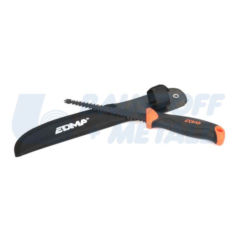 Саблен трион с двойни зъби 150 мм EDMA CROCOPLAC II, с включен кобур, за рязане на гипсокартон, пенобетон, дървени плоскости и др., със зъбци от двете страни за многопосочно рязане, глава с тризъбец за направата на предварителни отвори или монтаж на метална котва, лек и лесен за работа, с ергономична дръжка от два материала, производител EDMA Франция.