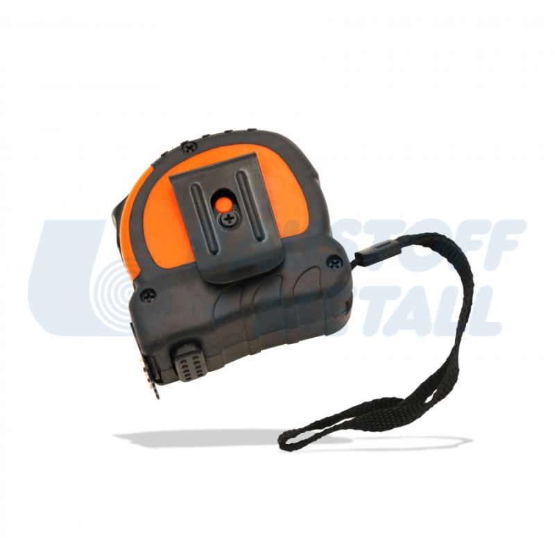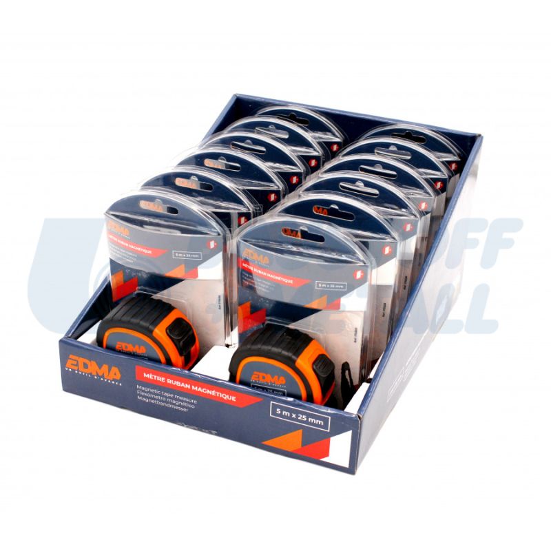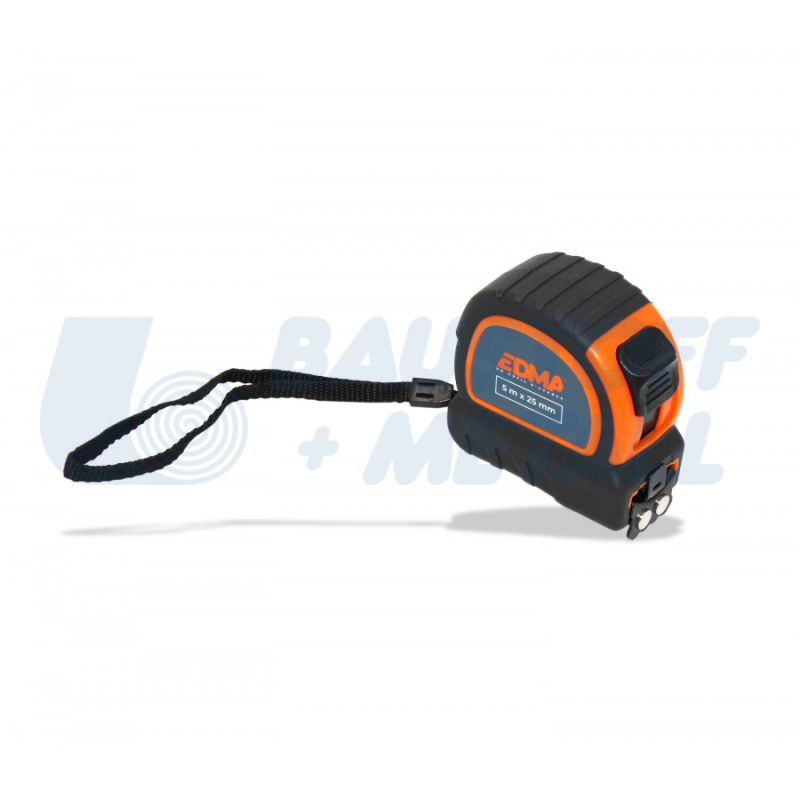 Ролетка магнитна EDMA 5 м x 25 мм, с магнитна двойна кука за лесно измерване, с лента с найлоново покритие, защитена от прах и вода, двойна маркировка: хоризонтално и вертикално четене, клас на точност II, ергономичен и компактен дизайн, подсилен и противоплъзгащ калъф, снабдена с 2 бутона: спиране и заключване на лентата, кука за колан + каишка, производител EDMA Франция