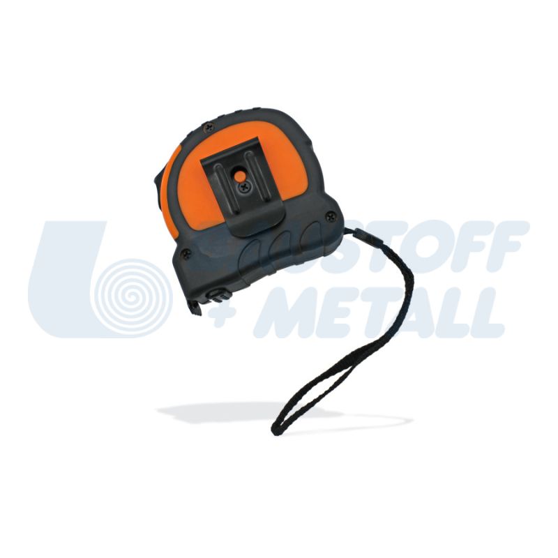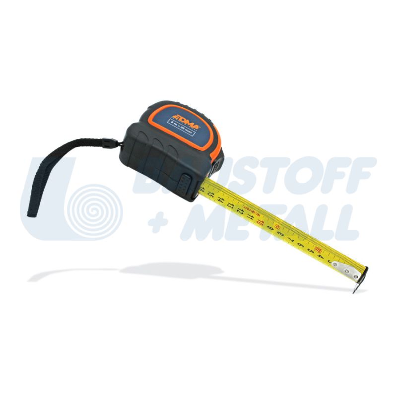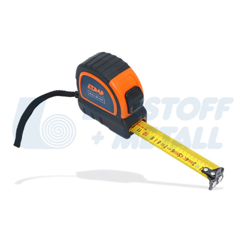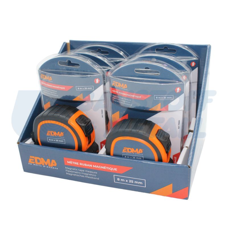 Ролетка магнитна EDMA 8 м x 25 мм, с магнитна двойна кука за лесно измерване, с лента с найлоново покритие, защитена от прах и вода, двойна маркировка: хоризонтално и вертикално четене, клас на точност II, ергономичен и компактен дизайн, подсилен и противоплъзгащ калъф, снабдена с 2 бутона: спиране и заключване на лентата, кука за колан + каишка, производител EDMA Франция