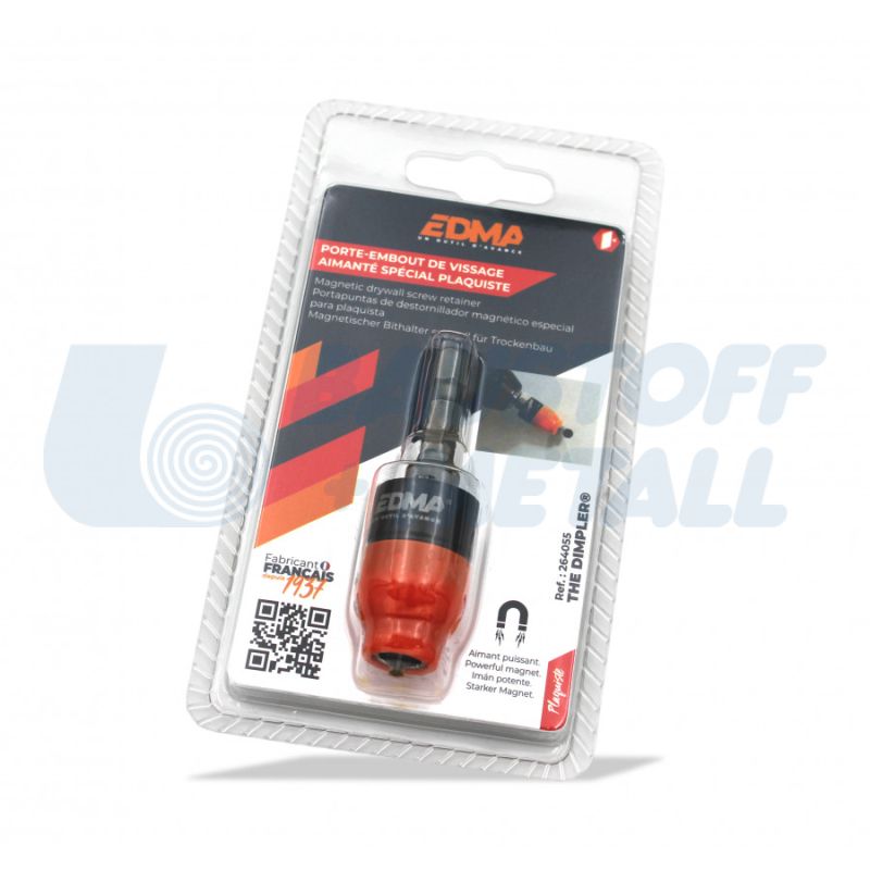 Магнитен накрайник за винтове в гипсокартон EDMA DIMPLER®, с мощен магнит, превръща вашата обикновена бормашина в професионален винтоверт за гипсокартон, с автоматично навива винтовете до необходимата дълбочина, предотвратява оголването на главата на винта, елиминира разкъсването на хартия от гипсокартон, идеален за гипсокартон и плочи от дървесни частици, със сменяем бит, с обратен режим, производител EDMA Франция
