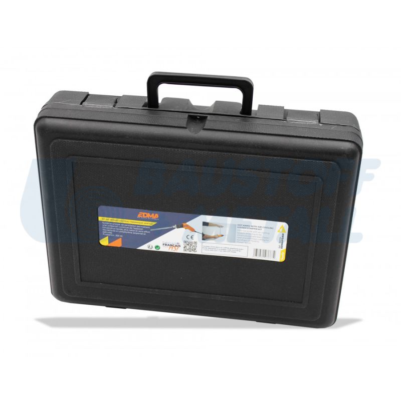 Термонож въздушно охлаждане EDMAFOAM - стартов комплект, за по-бързо, по-чисто и без усилие рязане на стиропор ЕПС и XPS, без прах, система за въздушно охлаждане, позволяваща непрекъсната работа, с мощност: 320 W, CE сертифициран, доставя се в пластмасова кутия, включваща: 200 мм острие, метална четка и ключ за фиксиране на острието, производител EDMA Франция