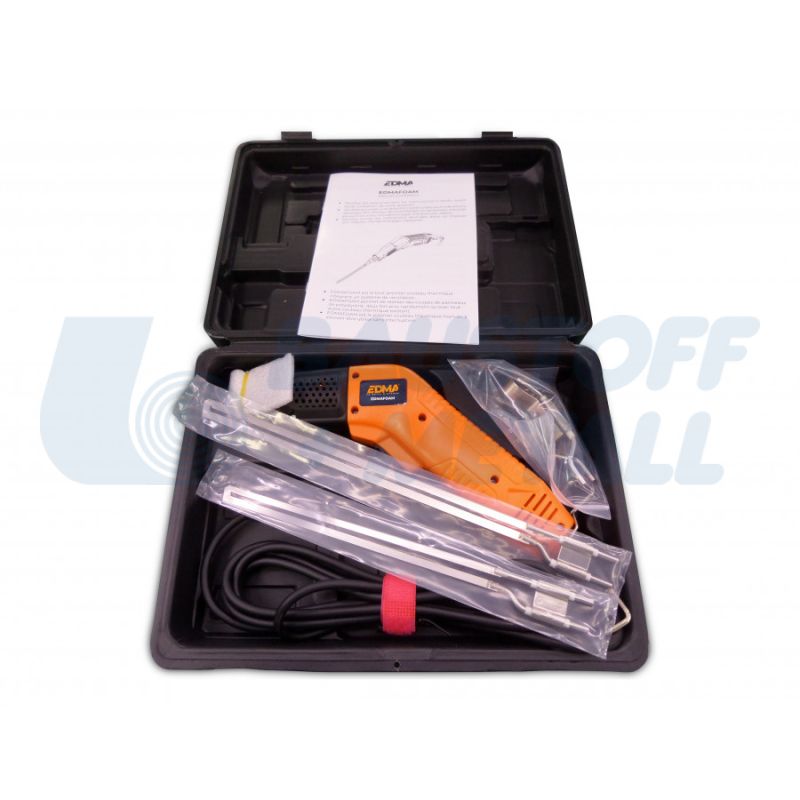 Термонож въздушно охлаждане EDMAFOAM - комплект 3 остриета, за по-бързо, по-чисто и без усилие рязане на стиропор ЕПС и XPS, без прах, система за въздушно охлаждане, позволяваща непрекъсната работа, с мощност: 320 W, CE сертифициран, доставя се в пластмасова кутия, включваща: 200 мм острие, 250 мм острие, 30 мм фреза за канали, метална четка и ключ за фиксиране на острието, производител EDMA Франция