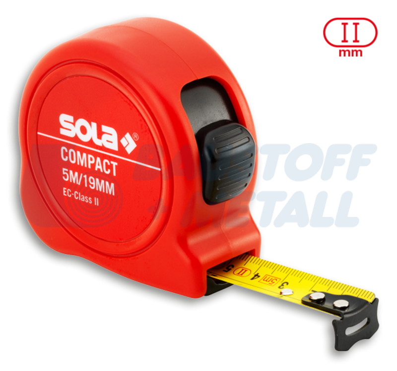Ролетка SOLA Compact CO 3, дължина 3 метра, широчина на лентата 16 мм, с корпус от удароустойчива ABS пластмаса, удобен, компактен дизайн на кутията, с прецизна лентова спирачка за точни вътрешни измервания, с подсилената начална част на лентата за защита срещу повреда, със здрава стоманена скоба за колан за сигурно задържане, скала в мм, EC клас на точност: II, материал на лентата от стомана с матово лакирана повърхност в жълт цвят, с начална кука на лентата, блокирировка на лентата, материал на корпуса: ABS, цвят на корпуса: червен, с щипка за колан от неръждаема стомана, производител SOLA-Австрия