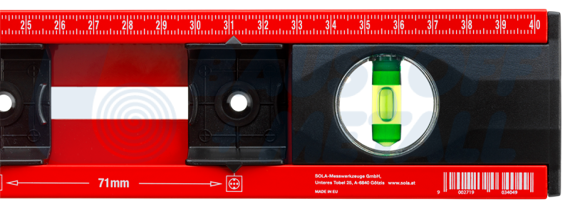 Нивелир алуминиев SOLA Electric, дължина 41 см, със специална електротехническа скала позволява 4 маркировки на стандартно разстояние от 71 мм, оборудван с 2 либели за вертикално и хоризонтално измерване с толеранс в стандартна позиция: 0,50 mm/m (0,029°), по-добро, по-бързо и по-точно отчитане чрез патентованите флакони SOLA FOCUS, здрав алуминиев С профил с гъвкави маркери с изключителна точност на измерване в стандартно и обърнато положение, с гравирана електротехническа скала през 1 мм, и с пластмасовите подложки предотвратяват плъзгането на нивелира, като същевременно защитават повърхността, размери 56 х 18 х 410 мм, производител SOLA-Австрия