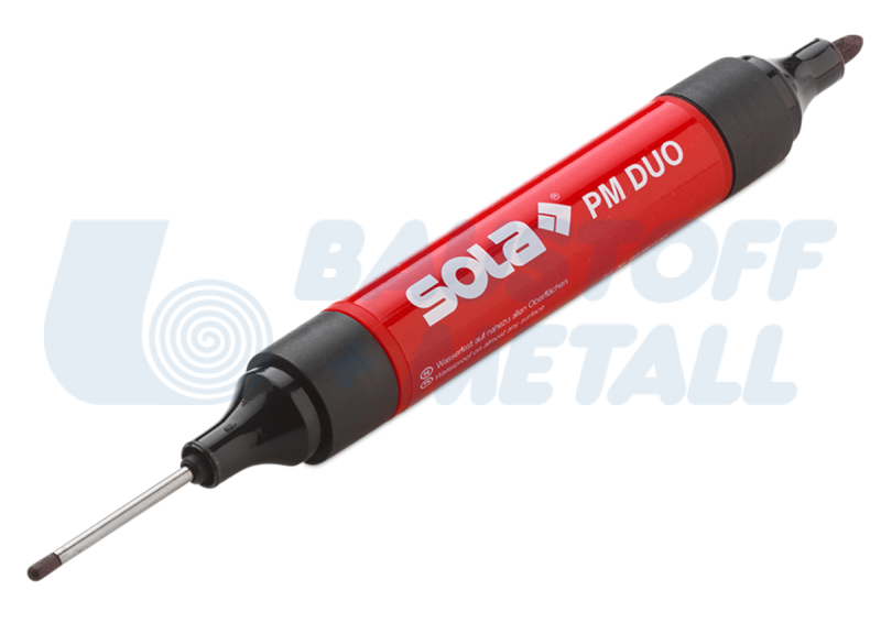 Перманентният маркер PM DUO има тесен 25 мм връх от неръждаема стомана за маркиране на отвори и кръгъл връх с ширина на линията 1,5-3 мм за перманентно маркиране и всякакъв вид етикетиране. PM DUO дава възможност за безпроблемно превключване между различни приложения, без да се налага да сменяте писалката.