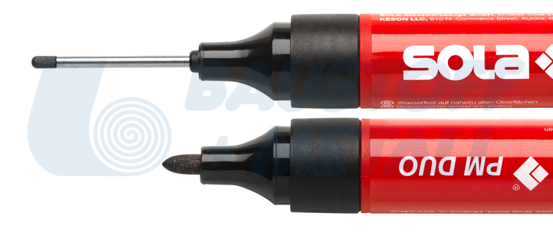 Duo перманентният маркер е подходящ за почти всички проекти. Тесният, дълъг връх от неръждаема стомана позволява прецизно трайно маркиране и следователно е перфектен за маркиране на отвори за пробиване и труднодостъпни места върху сухи повърхности. С устойчивия на натиск кръгъл връх на перманентния маркер и ширина на линията от 1,5-3 мм, маркирането и етикетирането е възможно на почти всички повърхности. Така перманентният маркер е идеален за използване върху различни материали като стъкло, метал, дърво, пластмаса, електрически кабели, хартия и др.