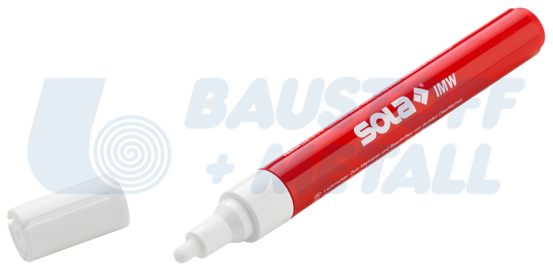 Индустриален маркер Sola IMW, цвят бял, водоустойчив на почти всички повърхности, за бетон, тухла, суха дървесина, хартия/картон, мокро дърво, метал, плочки/керамика, стъклена чаша, каучук, пластмаса и тъмни повърхности, с висока непрозрачност поради силна пигментация, ясно видим на тъмни повърхности, с удължен живот благодарение на оптимизиран реверсивен връх за писане, дължина 14 см.