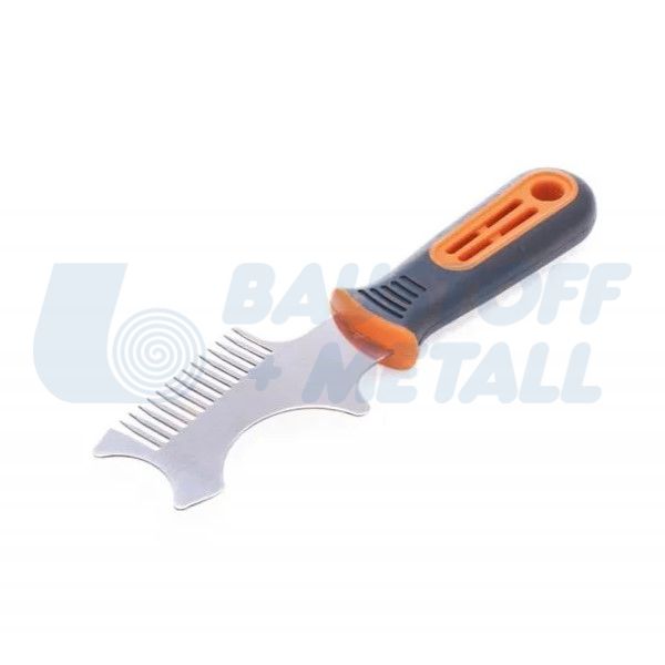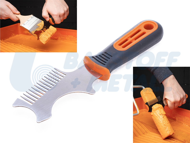 Предназначен за почистване - не само ще ускори процеса на измиване на валяка, но и ще спести боя, която трудно се отстранява от ролката или четката. Контурната форма на шпатулата е подходяща за почистване, както на големи и малки ролки, така и на четки, благодарение на гребеновиден връх. Изработена е от твърда неръждаема стомана и благодарение на гумената ръкохватка пасва стабилно в ръката ви.