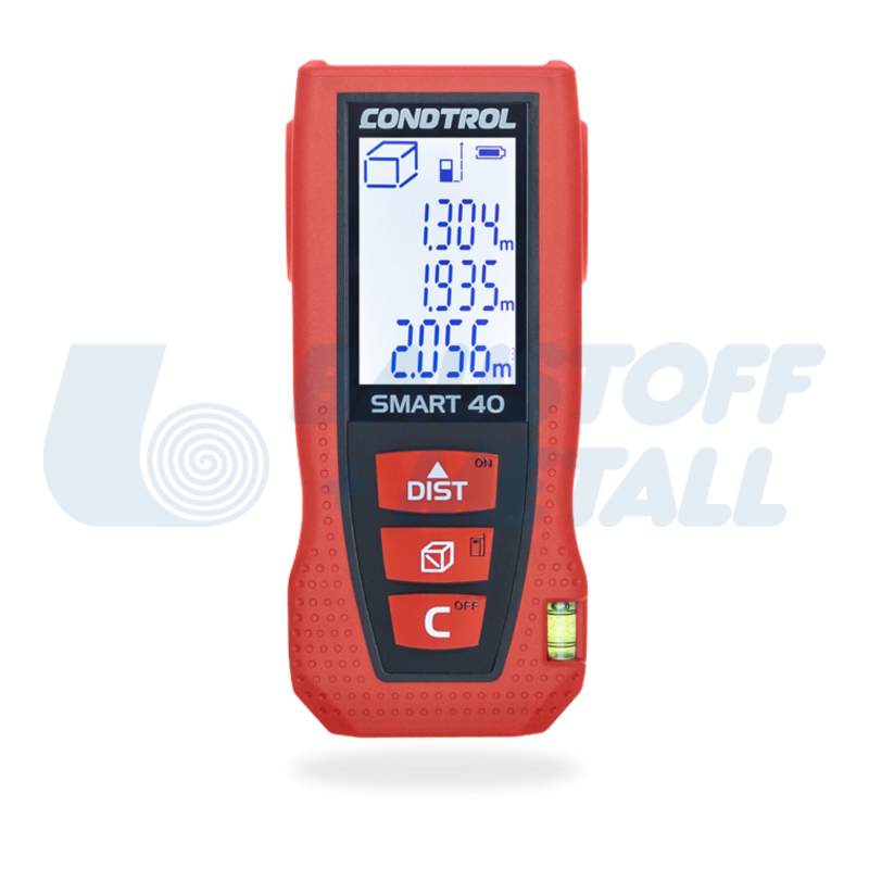 Лазерна ролетка 40 м Condtrol SMART 40, малка, компактна и удобна, тегло 83 гр. и размери: 105 x 47 x 27 мм, с обхват на измерване от 0,05м до 40м., с точност: ± 1,5 мм, работна температура: 0 °C… +40 °C, батерия 2 x 1,5 V, измерване на площ и обем, с измерване на базата на 2 възможни референтни точки (отпред и отзад на устройството), с 3-редов LCD дисплей с подсветка, индикатор за зареждане и автоматичен режим на заспиване, арт. № C14097, комплектът включва: каишка, кобур за съхранение, батерии и ръководство за употреба, производител CONDTROL Франция.