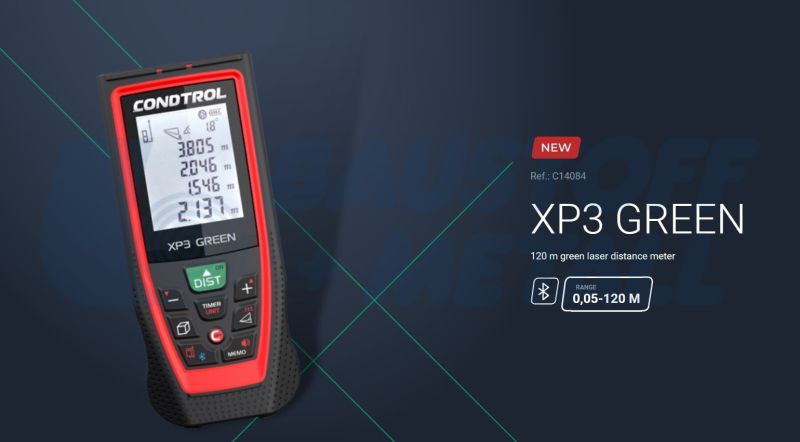 Лазерна ролетка 120 м Condtrol XP3 GREEN, със зелен лъч, с Bluetooth за дистанционно управление през вашия смартфон, тегло 170 гр. и размери: 136 x 59 x 28 мм, с обхват на измерване от 0,05м до 120м., с точност: ± 1,5 мм, 4-редов дисплей с подсветка, с функция събиране и изваждане, вградена памет от 30 стойности, работна температура: -10 °C… +50 °C, батерия 3 x 1,2 V 800 mAh LR03/AAA Ni-MH акумулаторни батерии, измерване на площ и обем, измерване под наклон, с измерване на базата на 4 възможни референтни точки, с таймер, с 3-редов LCD дисплей с подсветка, индикатор за зареждане и автоматичен режим на заспиване, арт. № C14084, комплектът включва: Каишка, рефлектор за разстояние, кобур за съхранение, акумулаторни Ni-MH батерии, кабел за зареждане и ръководство за употреба, производител CONDTROL Франция.