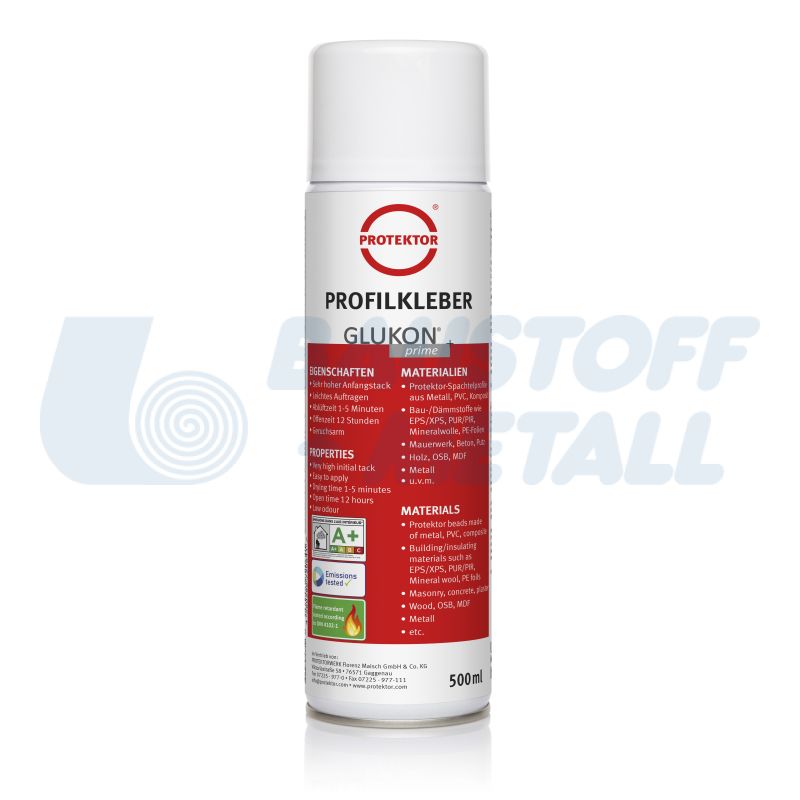 Спрей Лепило Protektor GLUKON prime, арт. № 1430, 500 мл, контактно лепило за монтаж на профили от композитен материал, твърд PVC или метал върху различни основи като гипскартон, подходящ е също за лепене на PE фолиа, пароизолации, изолационни материали като XPS/EPS и др., произведено в Германия