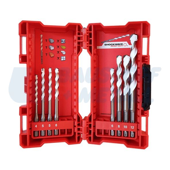 Свредлата за много материали Milwaukee® SHOCKWAVE™ са проектирани с твърдосплавен накрайник с 2 ножа, за да осигурят издръжливост заедно с гъвкавост за пробиване в широка гама здрави материали, включително; Бетон, тухли, керемиди, тънък метал, керамика, плочки, дърво, PVC, алуминий, гипсокартон и други. Снабдени с 1/4" шестостенна опашка, тези свредла за различни материали са съвместими с бормашини/винтоверти и ударни бормашини. Свредлата за различни материали MILWAUKEE® SHOCKWAVE™ осигуряват идеалното решение "всичко в едно" за най-широките разнообразие от материали, инструменти и приложения.