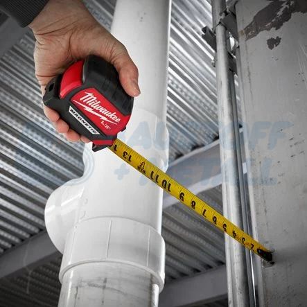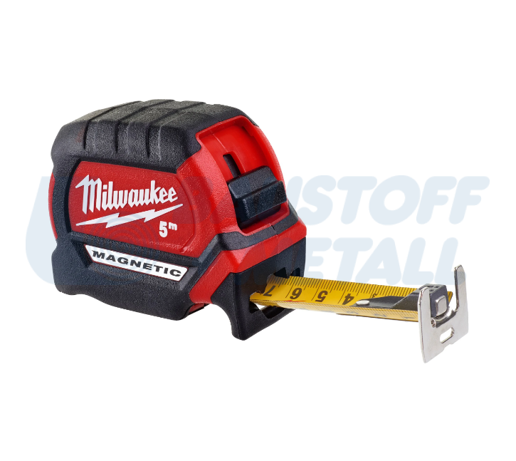 Противоударна магнитна ролетка Milwaukee 5 м, със силен магнит в началото на лентата позволява лесно закачане върху плоски повърхности и кръгли тръби, компактен и ергономичен дизайн, подобрено изпъкване до 3,4 m, с найлонова неотражателна защита на острието, до 10 пъти по-устойчива на повреда на работното място, 27 mm острие с двустранен печат върху лента за по-лесна четливост, патентован ограничител на пръстите: стабилен, когато стои сам, с 5-точкова подсилена рамка за издръжливост на работната площадка, клас на точност II, арт. No 4932464599