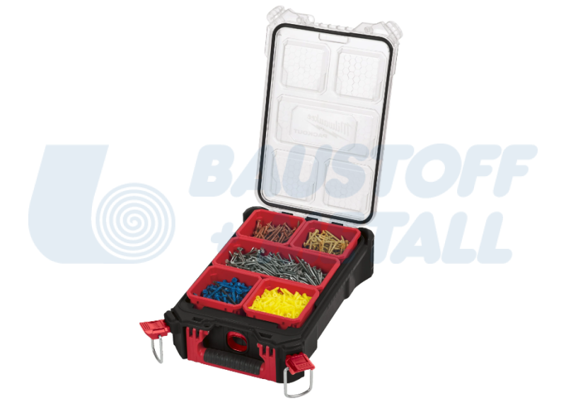 Органайзер Мilwaukee PackOut Compact Organiser, външни размери (В x Ш x Д ): 117 x 249 x 386 мм, изработен от удароустойчиви полимери за издръжливост на работната площадка, интериорът разполага с 10 подвижни и монтируеми кошчета, които могат да бъдат монтирани върху обичайните материали на работното място за лесен достъп, защита от атмосферни влияния с рейтинг IP65 за предпазване от дъжд и отломки от работната площадка, кошчетата без пътуване се уплътняват, за да се предотврати мигрирането на съдържанието им между кошчетата по време на транспортиране, част от модулната система за съхранение PACKOUT™, арт. No 4932464083