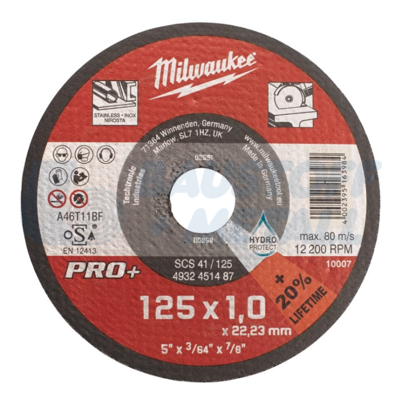 Диск за метал Milwaukee SCS 41 / 125 x 1 x 22 мм, Ф125мм / 1мм, произведено в Германия, най-подходящ за неръждаема и киселинноустойчива стомана, хардокс, топлоустойчива лята стомана, пружинна стомана, мека и инструментална стомана, с Pro+ технология за най-добър живот - хидрозащитен срещу влага за по-дълготрайна мощност, с по-голяма производителност и по-дълго време на работа от 1 mm pro+ и следователно оптимизиран за безжичен кабел, по-ниска загуба на материал, по-малко искри, арт. No 4932451487