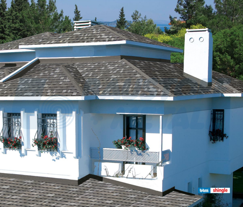 BTM двуслойна битумна керемида, подсилена с фибростъкло и хидроизолационна мембрана, изработена от оксидиран битум, който е покрит с пясък на долната повърхност и с цветни минерални гранули на горната повърхност.