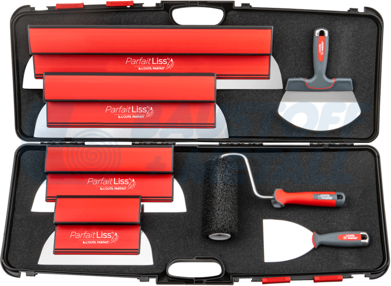 Комплект от 7 части: 4 бр. ножове за шпакловане ParfaitLiss'® Light с дължини 25, 35, 45 и 60 см, 1 бр. заоблена шпакла 19 см за кофи, 1 шпакла за гипсокартон Alu-choc® 10 см, 1 бр. валяк за шпакловане Roll'Enduit® с широчина 180 мм в куфар с размери: 82x30x8,5 см
