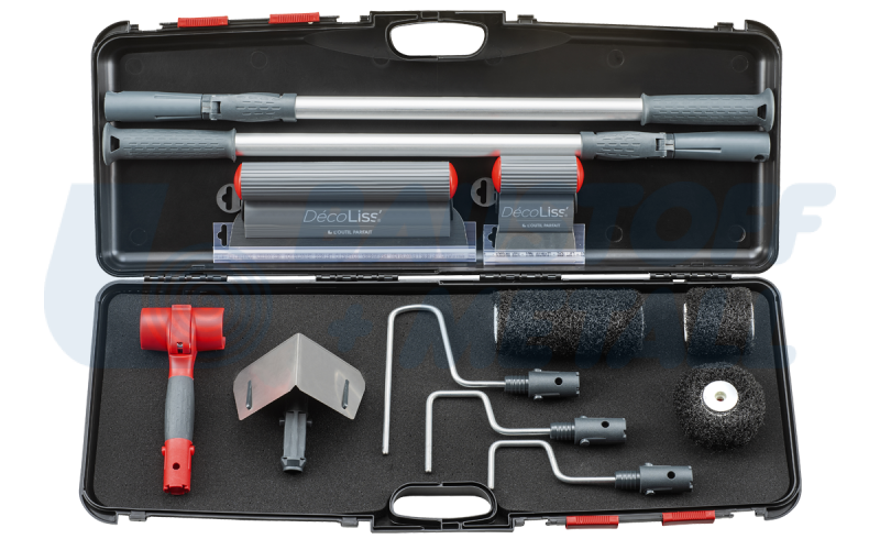 Комплект от 9 части: 2 бр. нож Décoliss'® Hard (10 и 30 см), 1 бр. теледскопична дръжка Décoliss'® Clip'System с дължина 2x0,70 м, 1 бр. ъглова шпакла DécoLiss'®, 3 бр. дръжки за валяци Roll'Enduit'® (ъглов валяк 40 мм + валяк 80 и 180 мм).