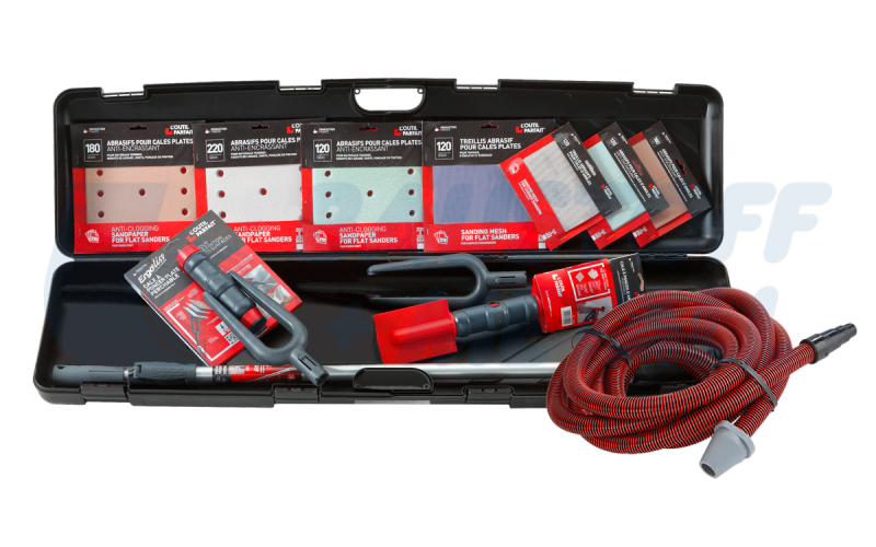 Комплект Loutil Parfait ErgoLiss® - 74 части за подготовка, за шлайфане без прах, система за вакуумно шлайфане за използване със специална телескопична дръжка, вакуумът е интегриран в остовният блок за шлайфане, съвместими с дръжката, супер лек за допълнителен комфорт и ефективност, с широк работен диапазон благодарение на регулируемата глава на блоковете, с довършителна шкурка и самозахващаща се шлифовъчна мрежа, съдържание: 74 части: 2 бр. шлайфа: 1 бр. плосък и 1 бр. ъглов, 1 бр. телескопична дръжка + 1 бр. маркуч към прахосмукачка, 30 бр. плоска шкурка с едрини 120 / 180 / 220 + 10 бр. мрежи с едрина/зърнометрия 120, 20 бр. ъглова шкурка: зърнометрия 120 / 180, + 10 бр. мрежи 120 зърнометрия в куфар с размери: 117 х 30 х 12 см, арт. № 80488
