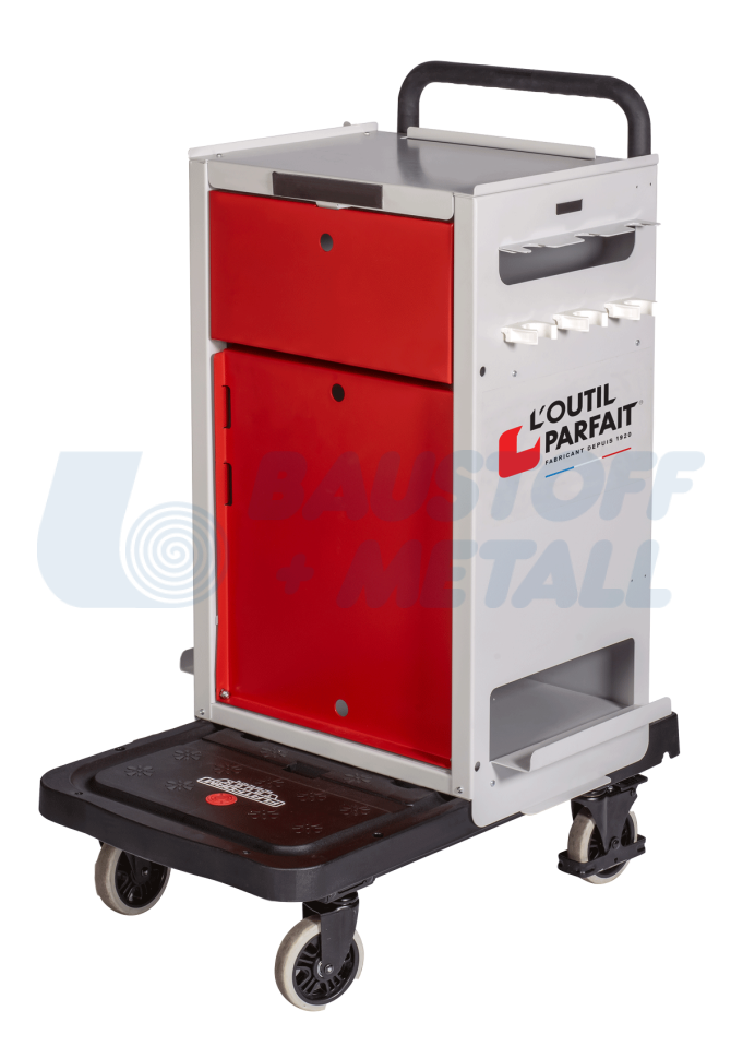Работна станция за инструменти Loutil Parfait OP Process'®, състои се от 1 сгъваема количка с полезен товар: 137 кг, 1 бр. метална кутия с работна повърхност 32 x 41 см, с удобна работна височина: 85 см на колела, сгъваема транспортна количка: с 4 Ø10 въртящи се на 360° гумирани колела, 2 бр. задни спирачки, размери на тавата: 67 x 41 см, 1 бр. метална кутия със специално място за съхранение на консумативи и инструменти, многофункционални опори за телескопични дръжки, Roll'Cut, тави за ножове за шпакловане и заглаждане, ролка тиксо или маскираща лента, щипка за магнитни ножове, наклонена повърхност за кофа за нанасяне на покритие или бункер за боя, с общо тегло на станцията: 22 кг, арт. № 3760001