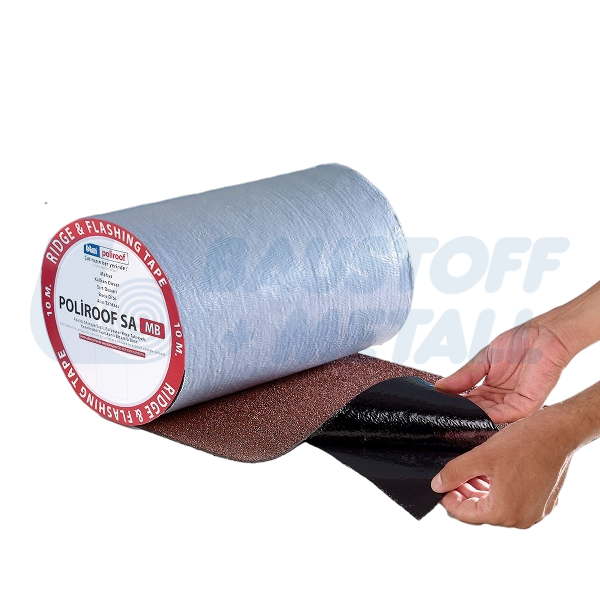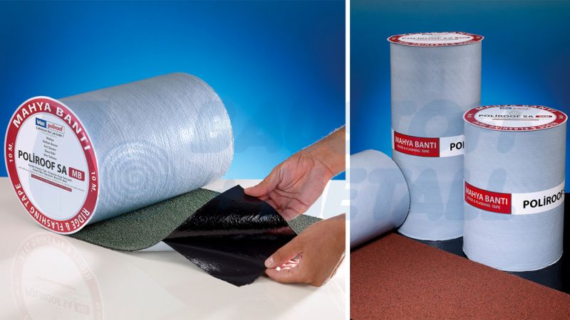 Poliroof SA MB, предлагащ трайни, практични и икономични решения в детайли като билото на покрива, скатна стена, задна стена, обшивка на комина и покритие на стрехите, е покрит с цветни гранули от керемиди и има полиестерна подложка и самозалепващ се битумен слой.