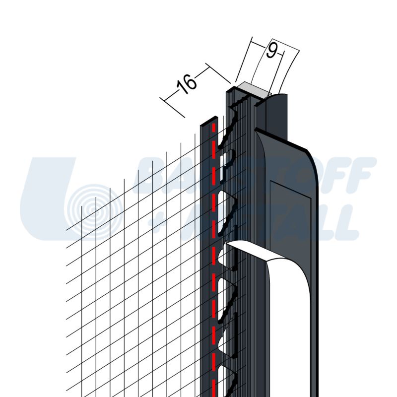 Изработен от PVC с пришита алкалоустойчива стъклена тъкан, защитен ръб и отлепващ се лепен капак за фолио, е подходяща за създаване на визуално и технически перфектни връзки на прозорци, врати и други компоненти към мазилки и ETIC системи. С перфорирана рамо и пришита тъкан за високоякостно свързване на мазилката.